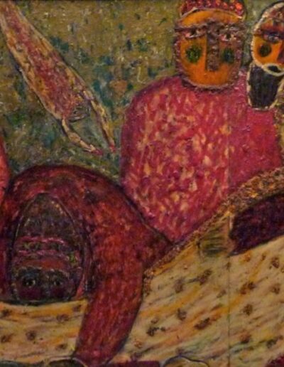 Spanier’s developing spiritual life is richly reflected in his later work, from the mid-1970s to the final years of his life, and it is even more manifest in the radiant explosion that has occurred of the color and light which were smoldering in the early works. The heavy, obstructing ambivalence of gestural black in the early works has receded to cloisonné lines enclosing figures and forms that range from single Rouault-like portraits and abstract figures, to landscapes redolent with sunlight… more