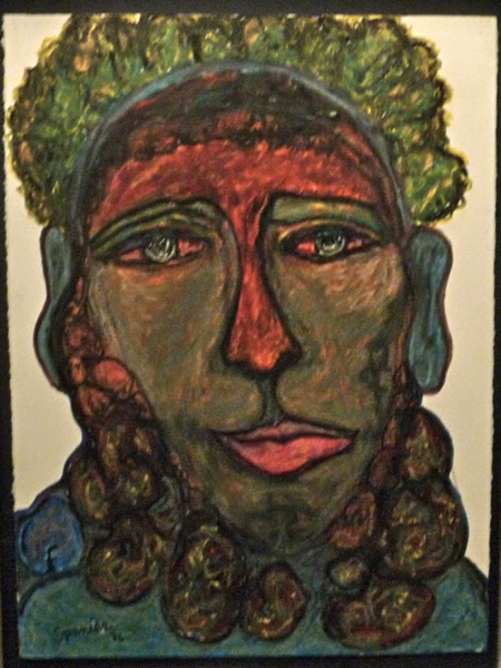 Spanier’s developing spiritual life is richly reflected in his later work, from the mid-1970s to the final years of his life, and it is even more manifest in the radiant explosion that has occurred of the color and light which were smoldering in the early works. The heavy, obstructing ambivalence of gestural black in the early works has receded to cloisonné lines enclosing figures and forms that range from single Rouault-like portraits and abstract figures, to landscapes redolent with sunlight… more